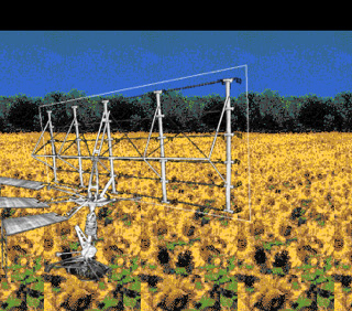 Scott Paterson's splash page confronts users with a cookie-collector that lets them select an identity ("who do you want to be?") before serving it back in a "stat.vhcl" that lists the time of visit, the visitor's name, the number of visits and the browser used. Like the stripes of black at the top and bottom of the page, the stat counter foregrounds the computer interface. Paterson provides an ironic counterpoint in the form of a bucolic field of sunflowers, but a close look shows that this image, too, highlights its own artifice: an abrupt, straight cut in each sunflower reveals that the same picture file has been pasted several times. Paterson is an artist, architect, and designer whose work explores the intersections of technology and physical space.